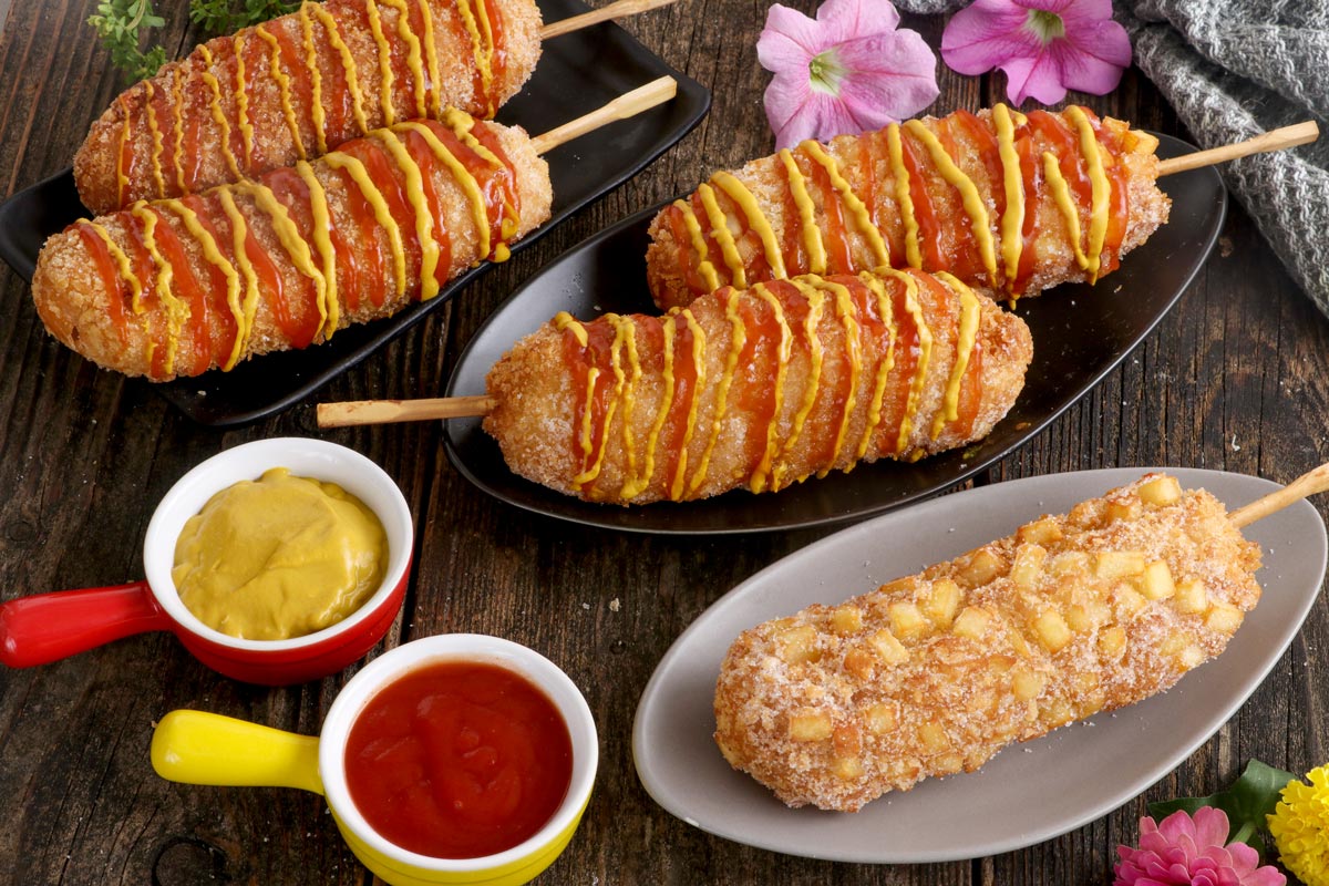 What it is: Sausage (or cheese) on a stick, battered and deep-fried. Toppings include sugar, ketchup, mustard, or potatoes.